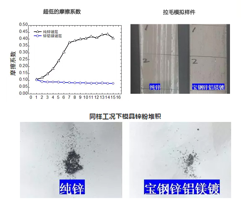除此之外,寶鋼鋅鋁鎂鍍層還有具有優異的成形性能,更適合汽車零件加工,如:摩擦系數低、鍍層磨損少、拉毛缺陷輕等優點。我們還是拿數據說話: